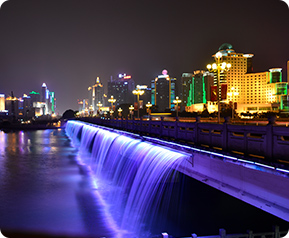 水景照明為渲染水景的藝術(shù)效果,根據(jù)水景的類別,對自然水景(江河、瀑布、海濱水面及湖泊等)和人文水景(噴泉、疊水、水庫及人工湖面等)設(shè)置的景觀亮化工程。