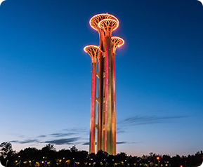 構(gòu)筑物夜景照明用燈光再現(xiàn)構(gòu)筑物的城市夜景照明。照明對象有碑、塔、路、橋、隧道、上下水道、運河、水庫、礦井、煙囪、水塔、蓄水池、貯氣罐等等。鑒于構(gòu)筑物的特點是為特定目的建造,一般人們不在內(nèi)部生產(chǎn)或生活的特點。